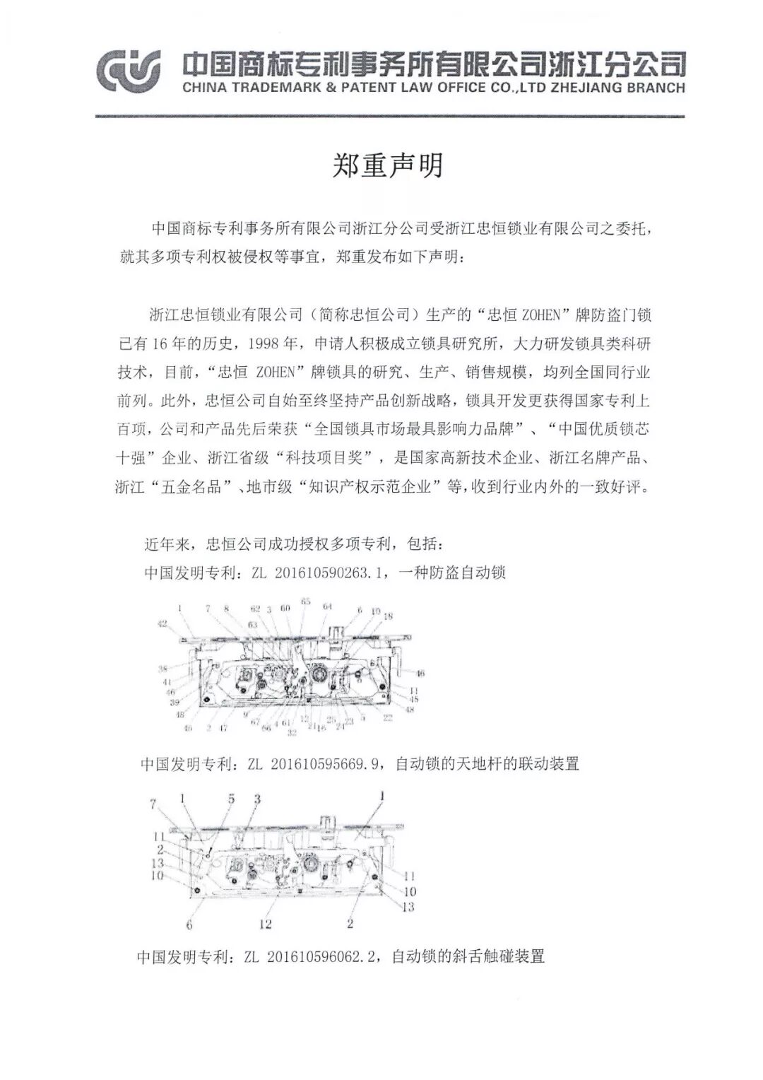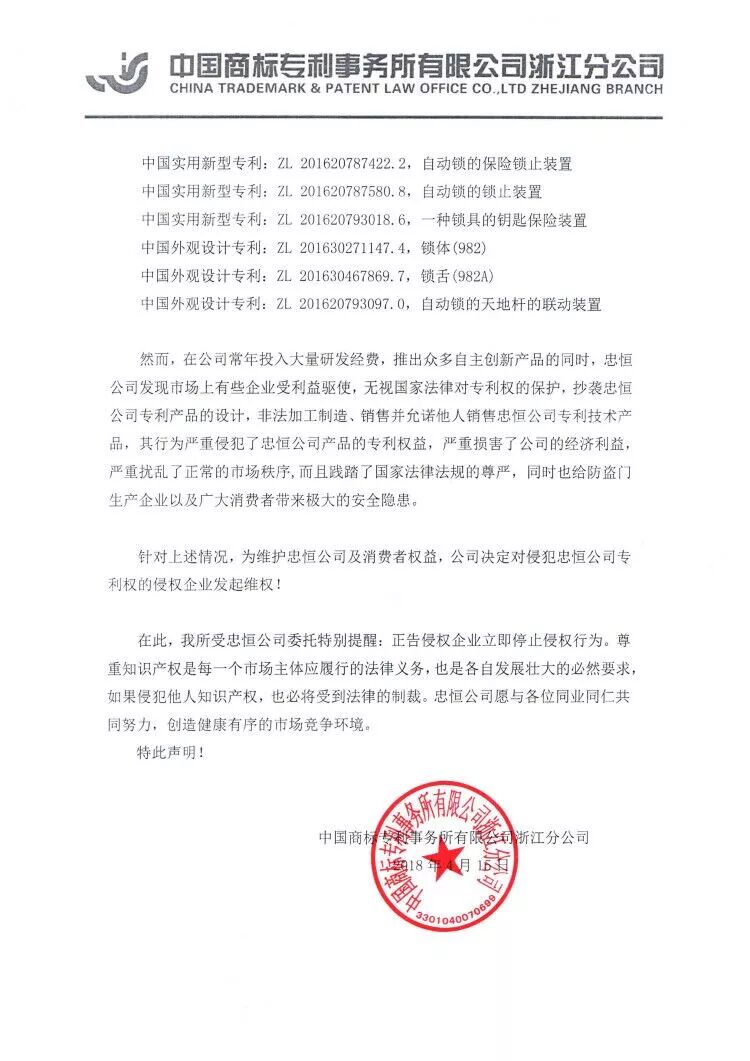 忠恒自始至终坚持产品创新战略,锁具开发更获得国家专利上百项,先后荣获“全国锁具市场最具影响力品牌,“中国优质锁芯十强”企业,浙江省级“科技项目奖”,国家高新技术企业,浙江名牌产品,浙江“五金名品”,地级市“知识产权示范企业”等,收到行业内外的一致好评。 每一个自主知识产权的诞生都不容易,是很多研发人员通过夜以继日的工作,才能产生成果,继而推向市场。我们欢迎全国企业寻求合作,但是,对于侵权的行为我司定会追究下去。最近,我们发现市面上有不少不法商家在未经忠恒公司及其法人代表柳小勇授权的情况下,违法生产和销售我司专利权产品。对此,我司授权中国商标专利事务所有限公司浙江分公司就侵犯忠恒专利权事宜,郑重做出声明: 请侵权者立即停止生产、销售、许诺销售等一切侵权行为,否则我司将继续授权中国商标专利事务所有限公司浙江分公司进一步采取法律措施,依法追究其民事、行政和刑事的法律责任。